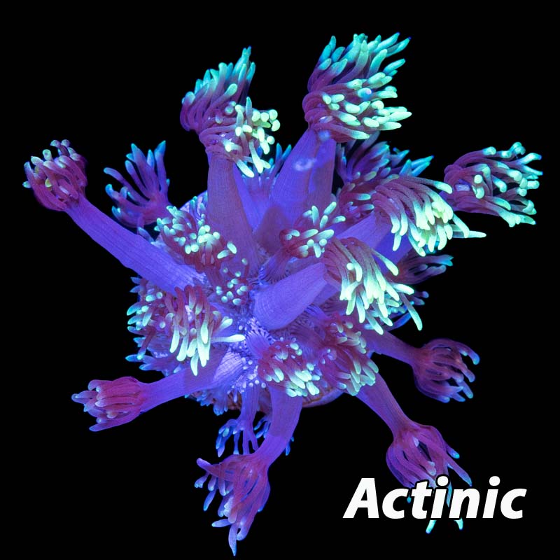 Our Gamora Goniopora has a pure purple base and stalks leading up to bright green tips on the tentacles. Frags of this coral have a 1/2" base with tentacles extending to roughly 1.5".