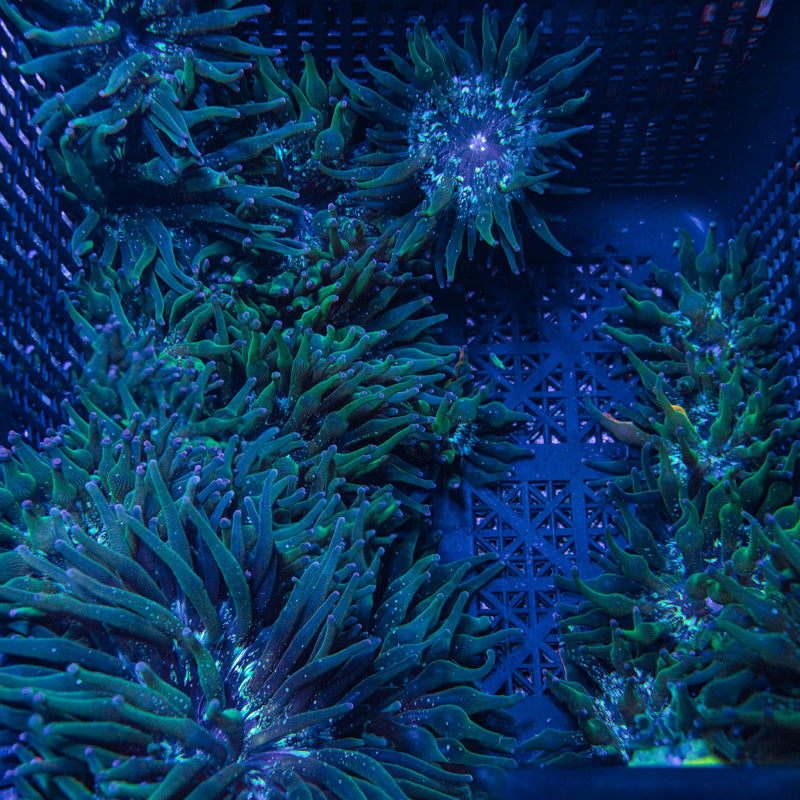 The Nexus Joker Bubble Tip Anemone is a new strain which comes from the splitting of the Nexus Burst Anemone. This anemone has a dark green color with a faint purple center and icy speckles and streaks across its body. The tips of the tentacles range from pink to purple. These anemones will be roughly 2-3” when opened.